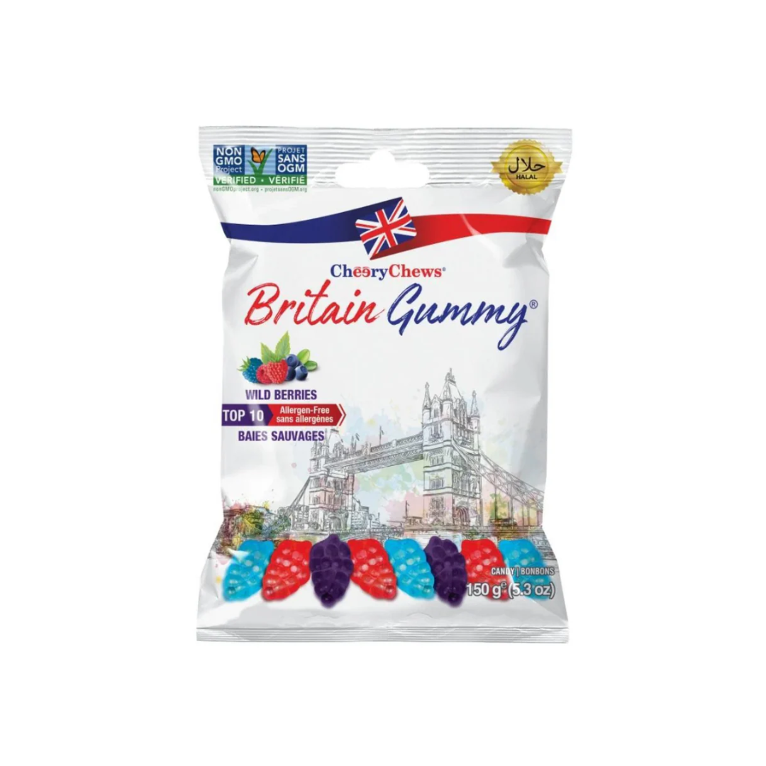 Sugars (glucose syrup, sugar), halal beef gelatin, modified corn starch, citric acid, fumaric acid, malic acid, apple juice from concentrate, artificial flavouring, turmeric(colour), titanium dioxide(colour), Brilliant Blue FCF (colour), Allura red (colour), Sunset yellow FCF(colour)